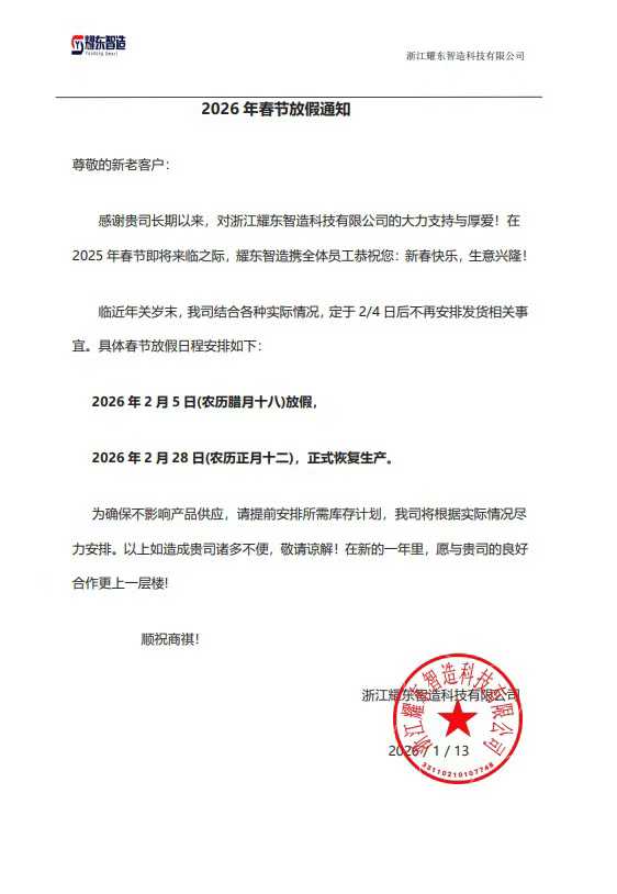 (Zhejiang, [aktuelles Datum]) Während das neue Mondjahr näher rückt, haben verschiedene Branchen mit ihrer jährlichen Überprüfungs- und Ruhephase begonnen. Heute hat Zhejiang Yaodong Smart Manufacturing Technology Co., Ltd. offiziell seinen Betriebsplan für das Frühlingsfest veröffentlicht und markiert damit den erfolgreichen Abschluss seiner Produktions- und Lieferbemühungen für 2025 und den Beginn des Endspurts vor den Feiertagen.